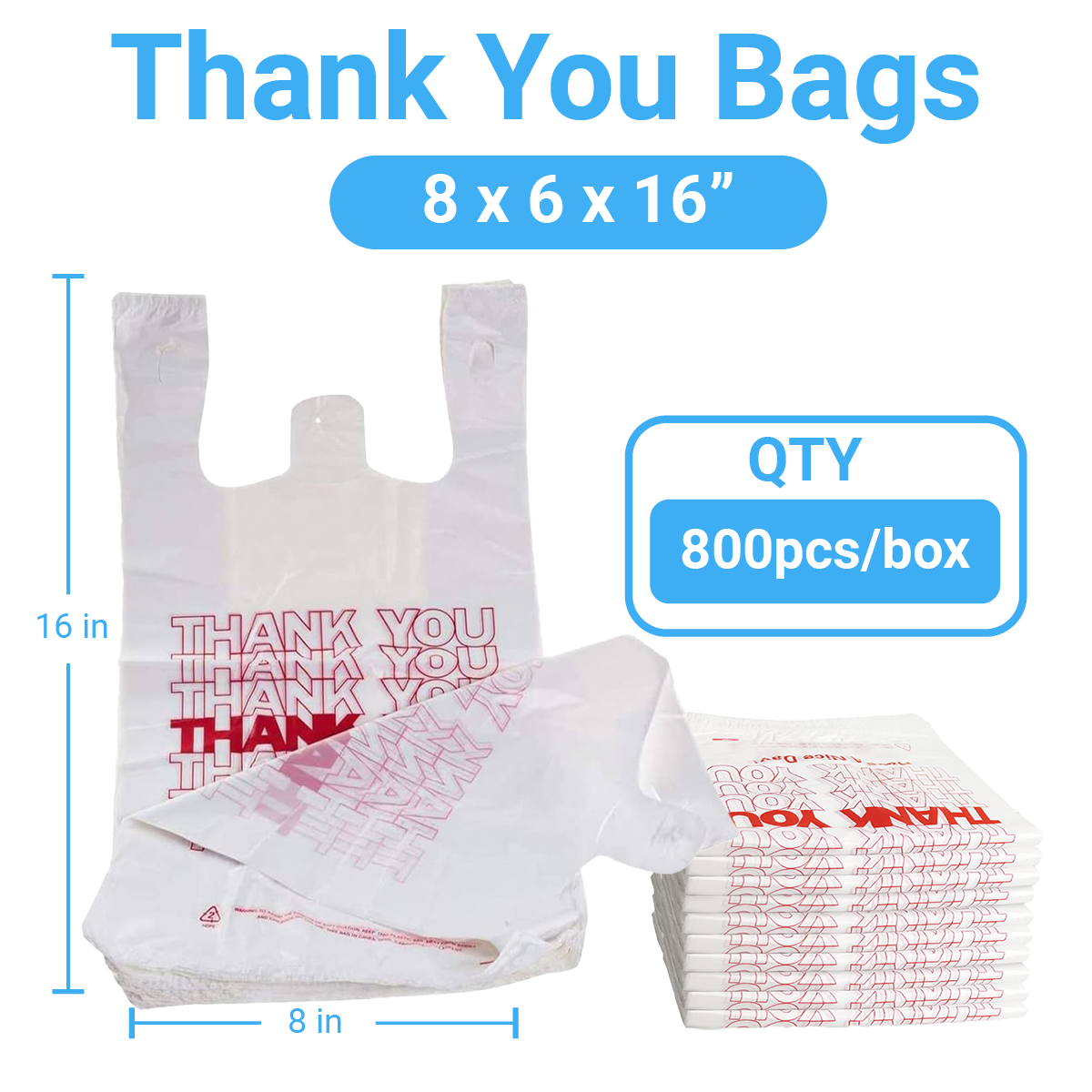 T-Shirt Bag, “Thank you”, 8in x 6in x 16in x 0.4mil, 800 pcs/box
