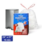 • Closure: Secure your trash effortlessly with our Titan Trash Bags. Boasting a convenient drawstring, handling your waste has never been easier.